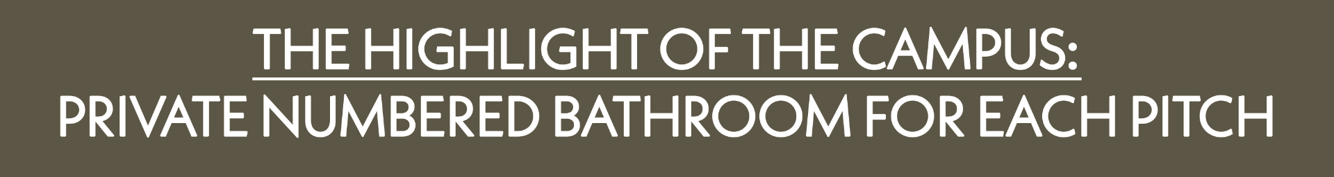 Each pitch is assigned its own private bathroom, located in a dedicated, numbered area to ensure maximum privacy, hygiene, and comfort.